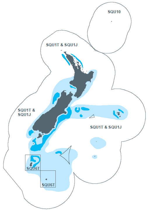 - Managed as three fish stocks: New Zealand’s Southern Islands (SQU 6T), the rest of New Zealand’s EEZ (SQU 1T and SQU 1J), and Kermadec (SQU 10T), which is not harvested
